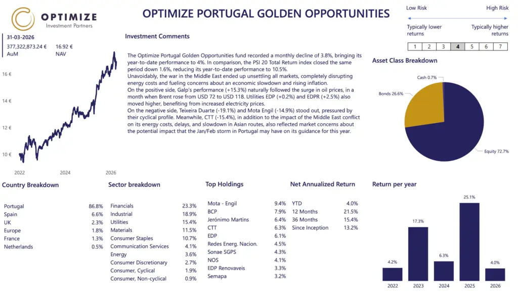 The fund aims to provide participants with long-term investment appreciation, by investing in a portfolio that has between 80% to 100% exposure to Portuguese domiciled companies. The fund invests in listed stocks, bonds, ETFs and mutual funds, does not have any exposure to real estate and it cannot be leveraged.